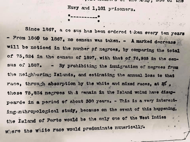 “By prohibiting the immigration of negroes from the neighboring Islands, and estimating the annual loss, to that race, through absorption by the white and mixed races, at 3%, those 75,824 negroes that remain in the Island would have disappeared in a period of 300 years. – This is a very interesting anthropological study, because on the event of this happening, the Island of Porto [sic] would be the only one of the West Indies were the White race would prevail numerically.” May 27, 1899.
