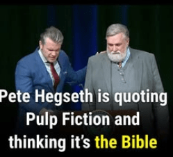 And then came the April 15 Pentagon cultist worship service in which Hegseth took almost directly from the film Pulp Fiction. “This prayer was recited by Sandy One, which is one of the Sandies, to all Sandies, all those A-10 crews prior to all CSAR missions, but especially this CSAR mission that happened in real time,” Hegseth said. “They call it CSAR 25:17, which I think is meant to reflect Ezekiel 25:17.”