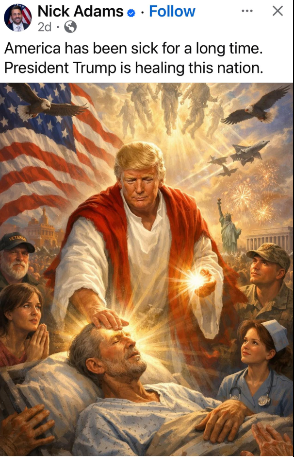 Nick Adams, the Australian-American MAGA commentator currently serving as the Special Presidential Envoy for American Tourism, Exceptionalism, and Values- posted this image on February 4, 2026 (Facebook)